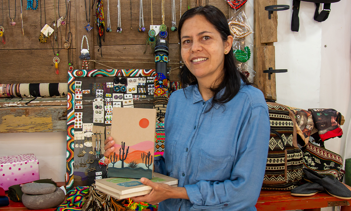 Cada una de estas experiencias hizo que esta mujer se dedicara, casi de lleno, al trabajo del arte y las manualidades, una labor que permite explorar su talento en diversas técnicas. “Con mi esposo traíamos artesanías desde Pasto y Ecuador, pero con el tiempo queríamos ofrecer otras cosas. Él tiene un taller de ebanistería y hace portalápices, percheros, alcancías, y junto con mis hijos, que también pintan, nos encargamos de hacer separadores y agendas”, cuenta Dalia mientras se prepara en su escritorio para iniciar una nueva jornada en su almacén Artes Dalia, que está próximo a cumplir tres años.